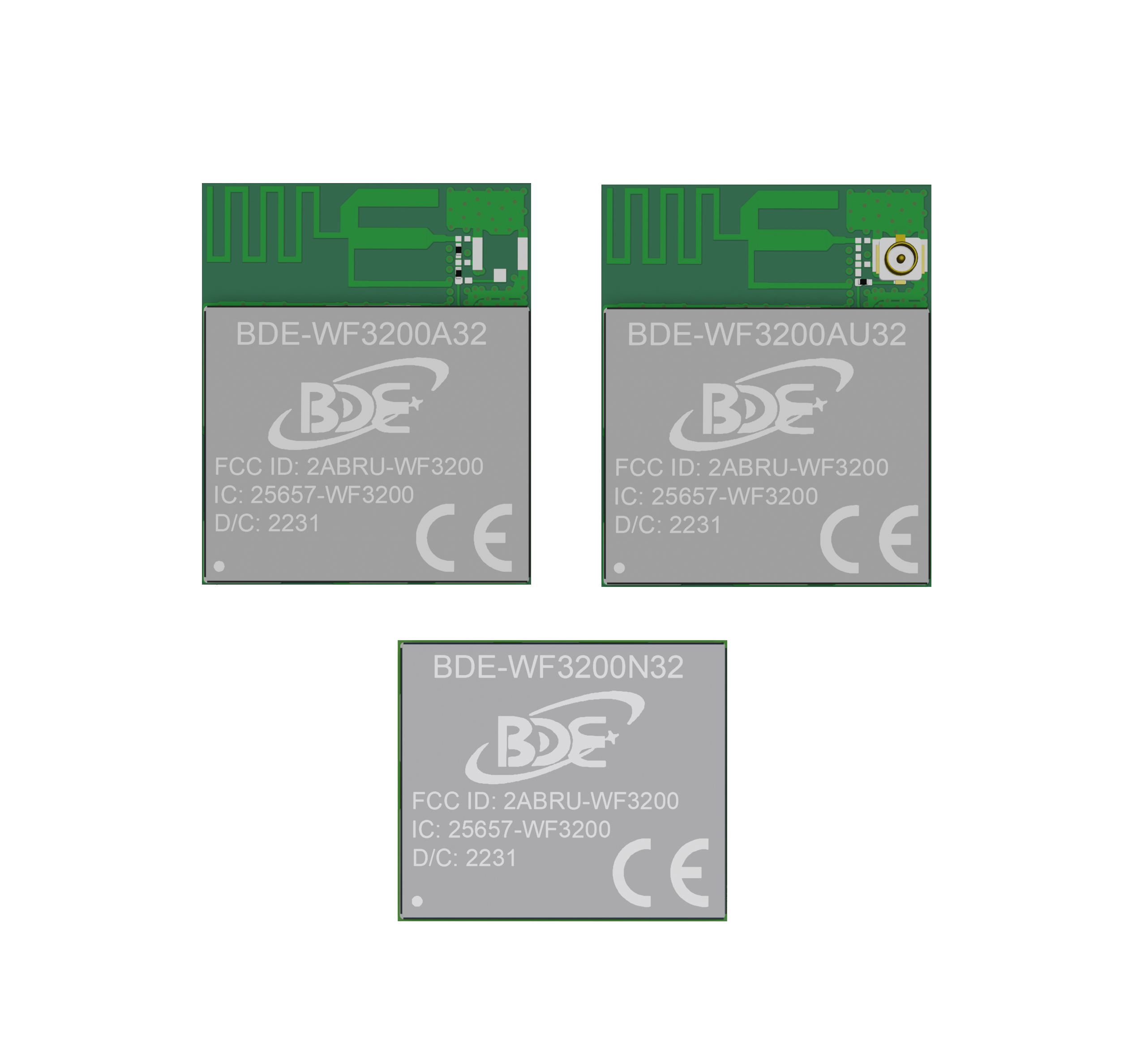 BDE-WF3200 是一款基于 Wi-Fi® 技术的模块系列,由 CC3200R1M2RGC 单芯片无线微控制器(MCU)组成。该系列提供三种选择:BDE-WF3200A32(集成印刷电路板天线版本)、BDE-WF3200AU32(U.FL 连接器版本)和 BDE-WF3200N32(无天线版本)。客户可以根据不同的应用场景选择合适的版本。
